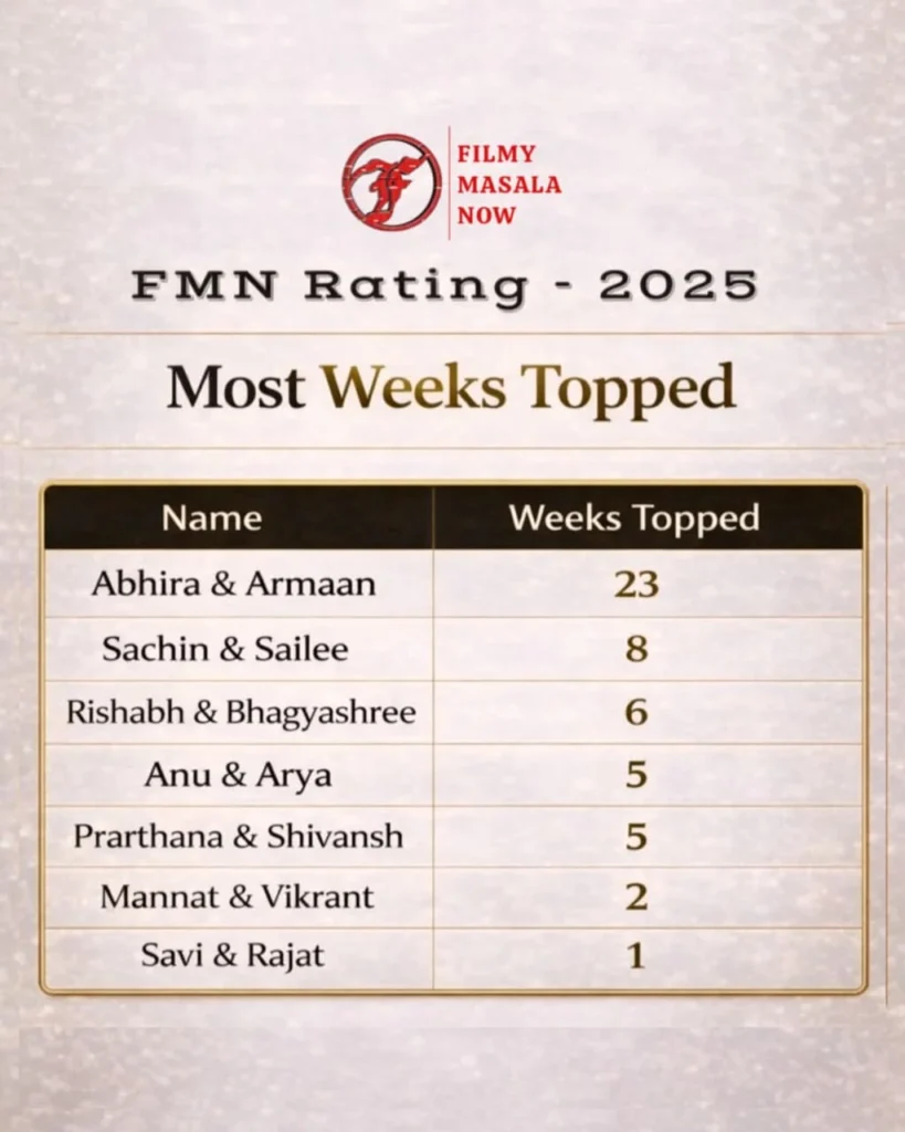 Abhira and Armaan have successfully reclaimed their crown. They were also declared the TV Jodi of the Year last year, dominating the FMN Rating charts for an incredible 37 weeks. This year, they continued their supremacy by topping the charts for 23 weeks, making it a remarkable total of 60 weeks at No.1 across the last two years — truly extraordinary.